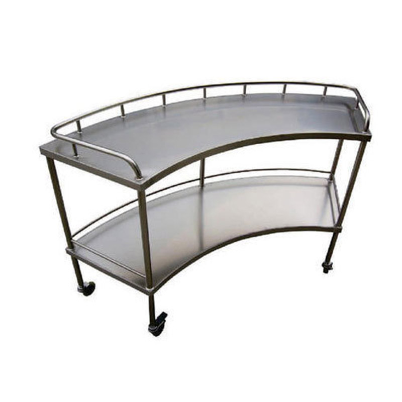 750mm*450mm*800mm Framework made of s.s. tubes Mounted on 100mm swivelling castors Two stainless steel shelves with three side railings on both shelves
